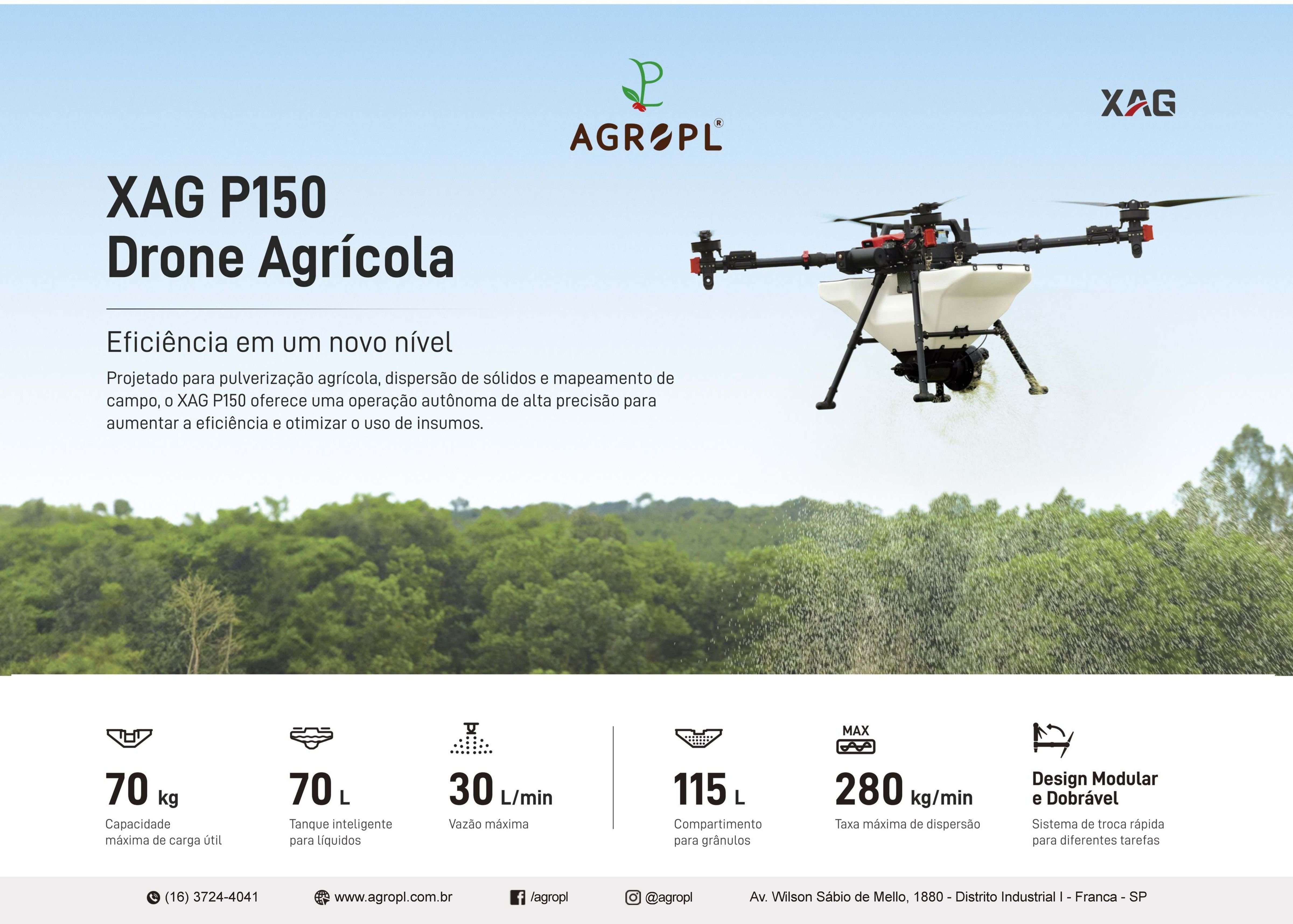 Projetado para pulverização agrícola, dispersão de sólidos e mapeamento de campo, o XAG P150 entrega uma operação autônoma de alta precisão. Ele é a escolha ideal para quem busca máxima performance, economia de insumos e agilidade nas tarefas.